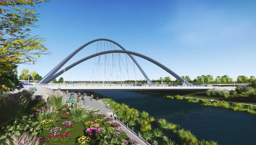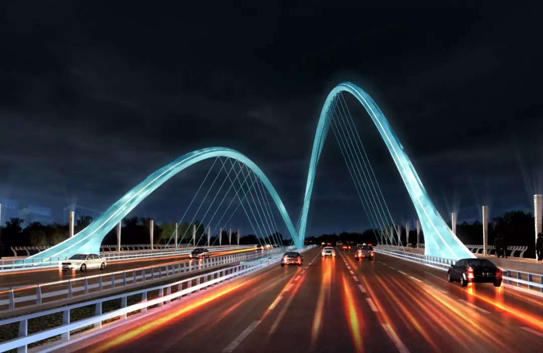 11號景觀橋以“融合”為主題,將流暢的線條融入景觀橋梁中,兩幅高低拱的線條無限延伸,猶如行云流水般瀟灑寫意,一氣呵成;同時,匯聚為一體的主拱又形成了“門”的形象符號,迎接著八方來客。