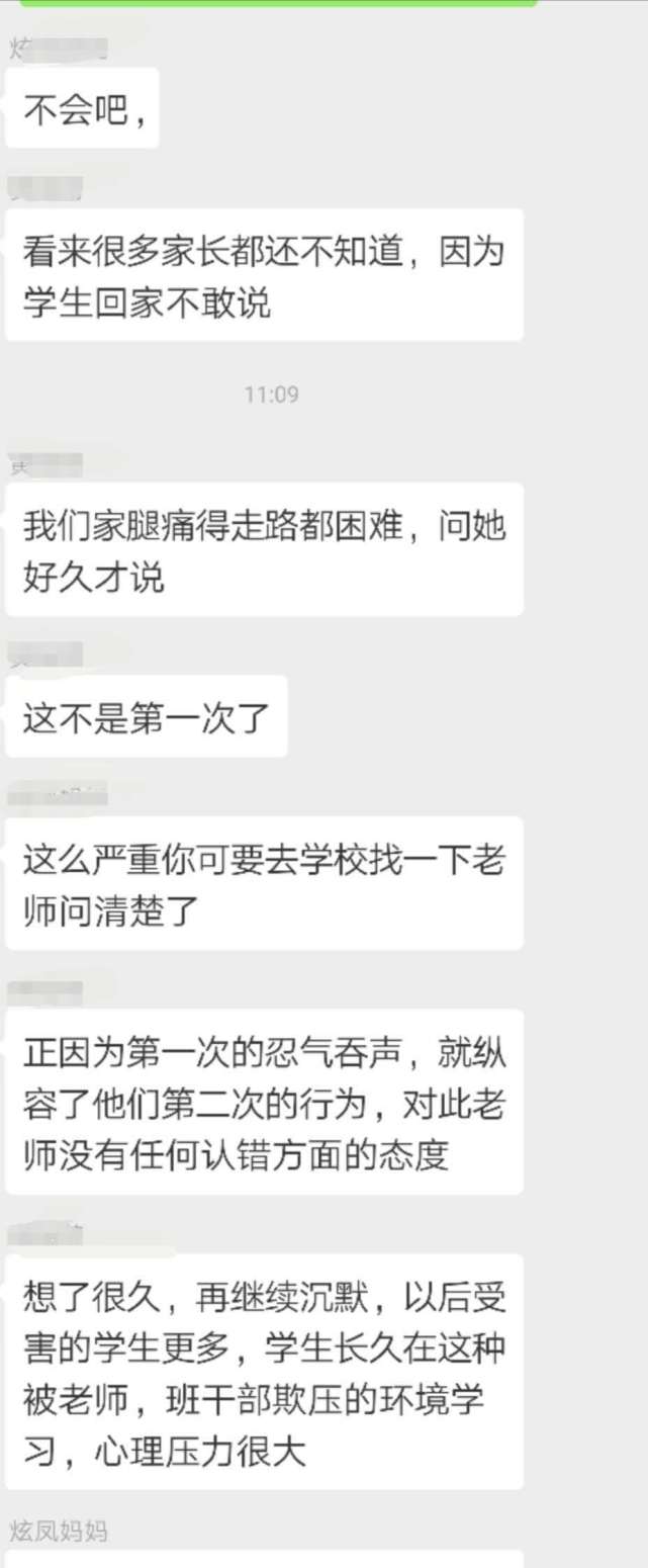 王先生把女兒的情況反映到家長群里,結(jié)果群里的家長紛紛表示,自己的孩子也反映當天遭遇到班長的毆打,有的孩子甚至“腿疼得難以走路”。而據(jù)孩子反映,其實類似的毆打在班上已經(jīng)不止發(fā)生過一次。這名班長是女生,平時很受班主任的信任,經(jīng)常利用班干部的權(quán)力隨意懲罰學(xué)生?!八?jīng)多次要求班上同學(xué)給自己帶零食吃,不然就會被撕作業(yè)和毆打,還威脅不準告訴家長?!蓖跸壬Q,家長們已經(jīng)將情況反映給班主任,但是班主任的反應(yīng)“相當冷淡”,只是說會了解一下情況。25日下午,記者電話聯(lián)系到了王先生女兒的班主任,他表示已經(jīng)就此事對班長進行了批評教育,但對于班長此前多次毆打同學(xué)的行為他表示并不知情,“當初讓這名同學(xué)做班長是因為她成績好,而且守紀律。而且我覺得,孩子之間有些矛盾很正常?!卑嘀魅握f。(記者 李東明)