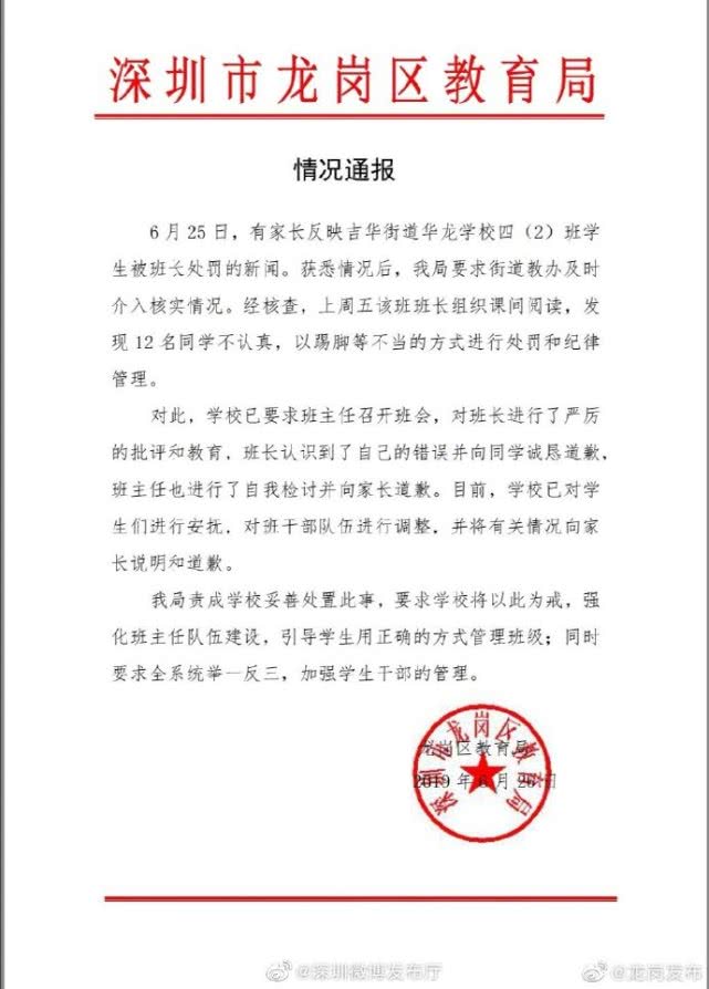原標題:30多名小學(xué)生排隊被班長“拳打腳踢”?龍崗區(qū)教育局通報來了