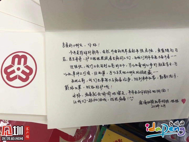 除了疫情防護的必需品,記者在這份暖心的“抗疫禮包”中還發(fā)現(xiàn)了一封字跡工整的信。信中寫道:親愛的小朋友,你好!今年是特殊的新年,雖然外面的世界看起來很危險,疫情隨處可見,醫(yī)生哥哥、護士姐姐照顧著生病的人們,為我們的平安努力奮斗著,但很快,我們又會回到從前的日子……劉贊告訴記者,這些漂亮的字跡出自她的同事肖可之手,雖然沒能跟姐妹們一起慰問,但肖可還是希望能盡自己的一份力,讓這份禮包更加溫暖,讓孩子們更加快樂開心。