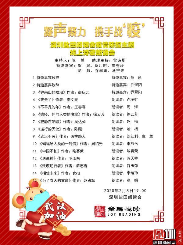 見圳客戶端?深圳新聞網(wǎng)訊(記者 潘峰 通訊員 徐云芳)近日,全民悅讀深圳鹽田閱讀會舉行了一場“凝聲聚力,攜手戰(zhàn)疫”抗擊疫情線上主題朗誦會,為打贏防控疫情阻擊戰(zhàn)加油鼓勁。