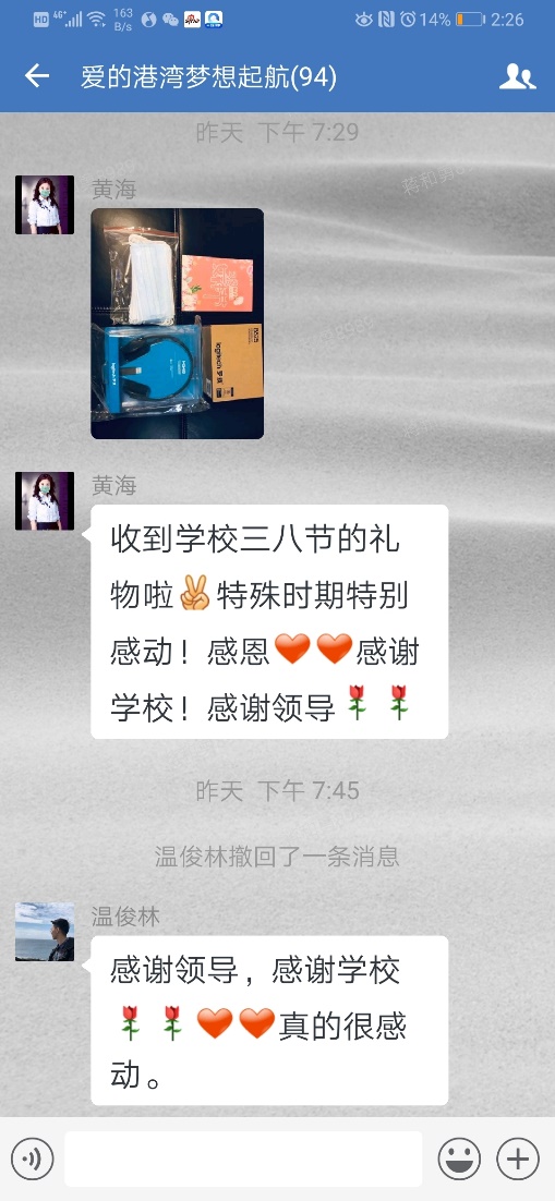 這一次,節(jié)日,校工會(huì)一致建議為繼續(xù)做好后續(xù)的“空中教學(xué)”,讓老師確保健康,為他們一并寄上一套口罩。疫情面前,口罩遮住了他們的面龐,卻遮不住眼中溫暖的笑意;手套隔離了病毒的威脅,卻不會(huì)將心靈間傳遞的溫情隔斷。