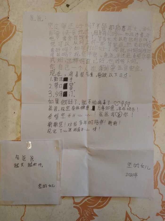 深圳晚報(bào)2020年3月9日訊 "爸爸:您過(guò)得還好嗎?不管那病毒再大,我們都要快樂(lè)地過(guò),因?yàn)槲覀冃倪B在一起……"日前,白云飛收到一封9歲女兒白家茵在高州老家給他郵寄的信件。看著女兒發(fā)來(lái)的一行行文字,白云飛動(dòng)容地說(shuō)道,"原本答應(yīng)她過(guò)年帶她去沙灘,聽(tīng)到我說(shuō)要提前回深圳與病毒作斗爭(zhēng),還叮囑我一人在外注意安全。"紙短情長(zhǎng),他感覺(jué)自己的女兒長(zhǎng)大了,他為女兒的堅(jiān)強(qiáng)懂事而感動(dòng)和自豪。"由于工作原因,爸爸需要提前回到工作崗位。等疫情過(guò)后,爸爸也抽時(shí)間好好陪你一下哈……"白云飛字里行間寫(xiě)下了對(duì)女兒的愧疚之情。