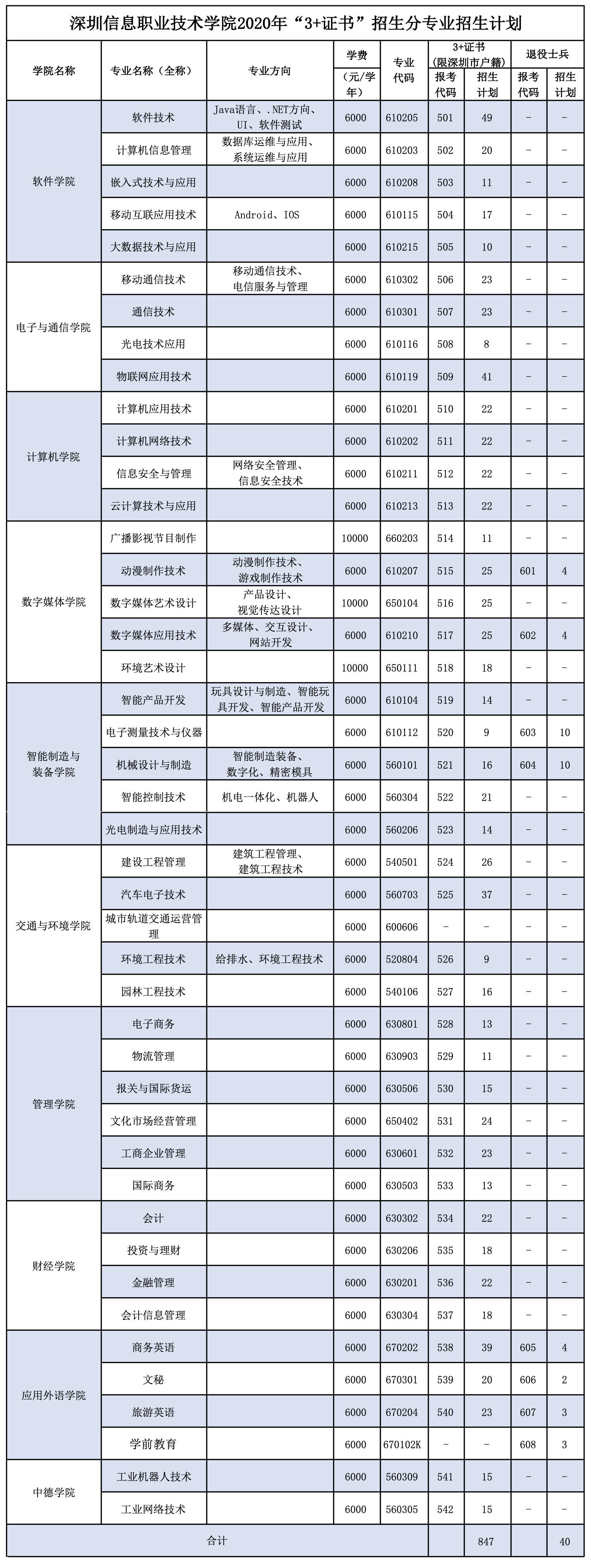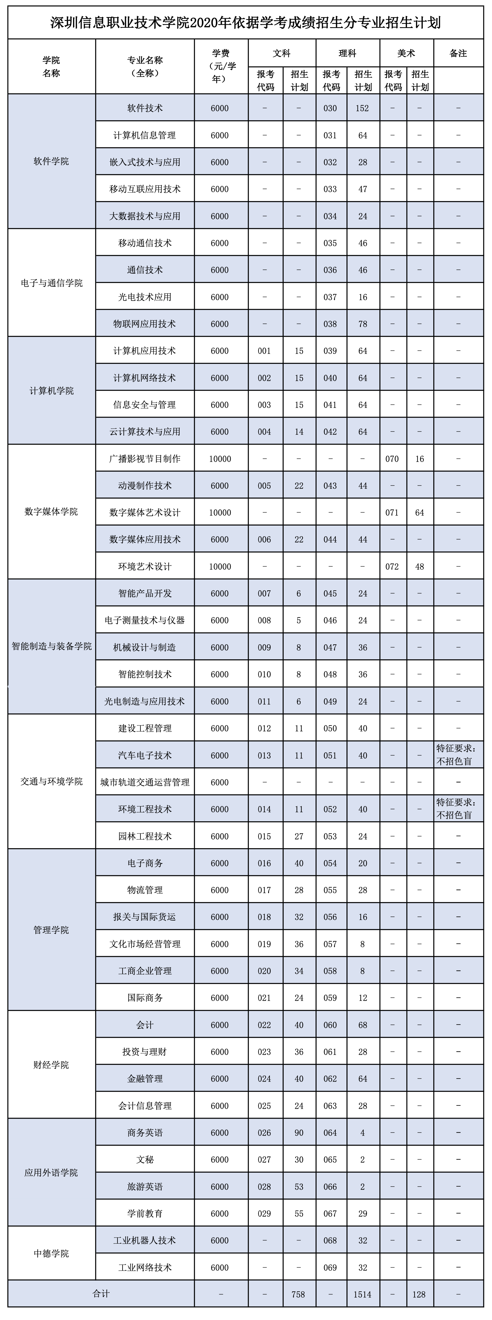 “依學(xué)考成績錄取”是深圳信息學(xué)院2020年春季高考招生重要形式之一,今年學(xué)校計劃招生2400人,面向文科計劃招生758人,理科計劃招生1514人,美術(shù)計劃招生128人。該校軟件學(xué)院、電子與通信學(xué)院、計算機學(xué)院、數(shù)字媒體學(xué)院、智能制造與裝備學(xué)院、交通與環(huán)境學(xué)院、管理學(xué)院、財經(jīng)學(xué)院、應(yīng)用外語學(xué)院、中德學(xué)院等10個學(xué)院均有招生計劃,招生專業(yè)共43個。