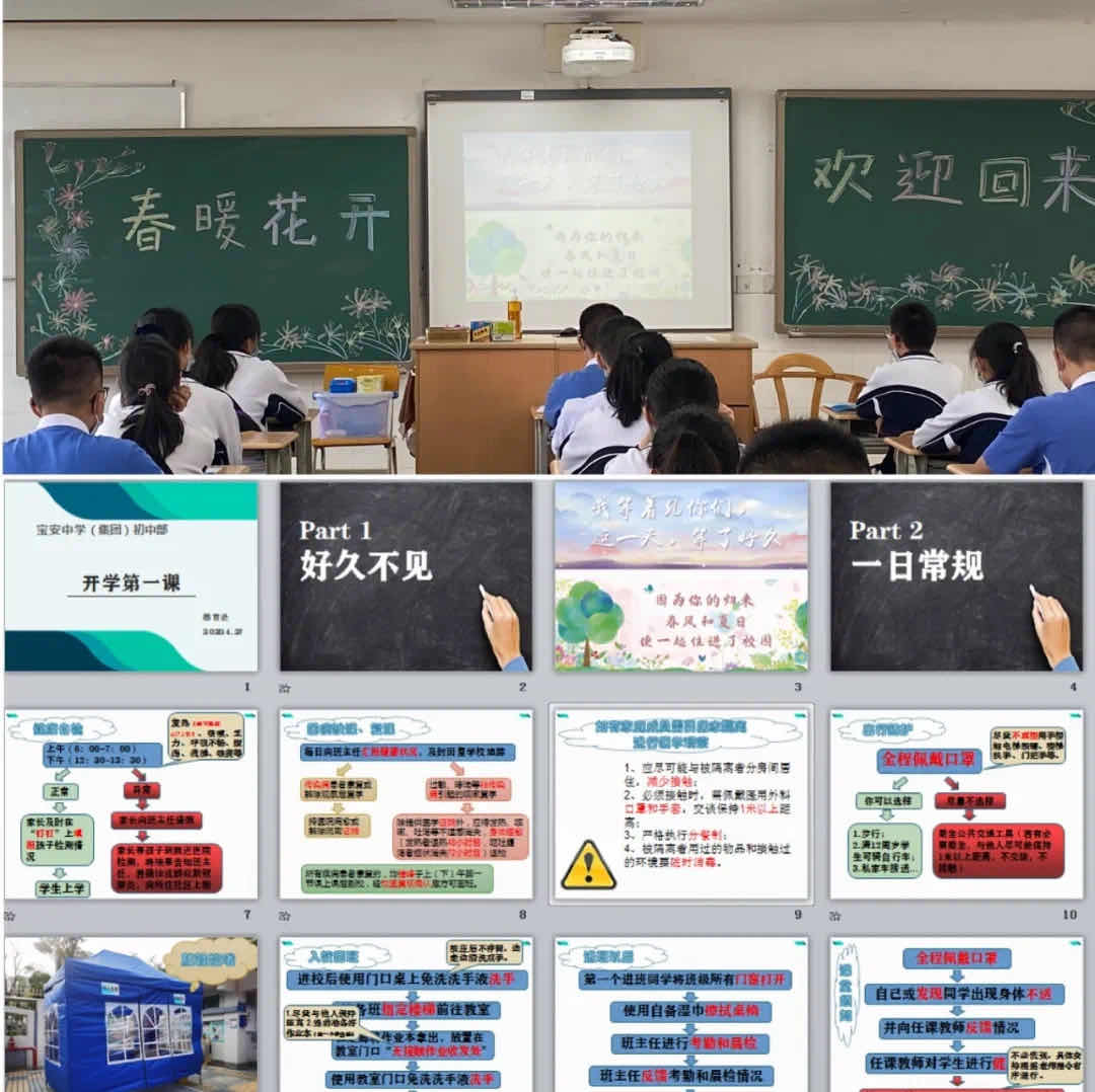 學(xué)校在校門外設(shè)立進(jìn)入通道,讓學(xué)生按照提前設(shè)置好的路線指引, 分批分流 進(jìn)入校園。學(xué)校課室的課桌擺放呈“一人一桌”制,樓道貼上站位地標(biāo),充分拉開學(xué)生安全間距離, 少交談少聚集 。除此之外,學(xué)校通過取消課間操、眼操等方式壓縮課間,實現(xiàn) 錯峰放學(xué) 。各班門前設(shè)置無接觸交作業(yè)區(qū),放置免洗洗手液,另外還特地為學(xué)生發(fā)放常規(guī)指引小冊子,制作了《寶安中學(xué)(集團(tuán))2020年春季學(xué)期返校復(fù)學(xué)指引》手繪視頻,開設(shè)了以防疫為主要內(nèi)容的“開學(xué)第一課”,讓防疫知識 入耳入腦入心 。